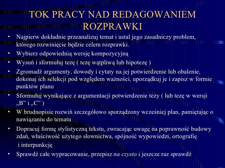 Rozprawka from image.slidesharecdn.com Rozprawka to rodzaj pracy naukowej, w której odpowiadamy na zadane pytanie, rozważamy swój stosunek do postawionego problemu lub domniemania, coś udowadniamy lub o czymś przekonujemy. Rozprawka jest pisemnym ujęciem rozważań nad określonym zagadnieniem. Rozprawka maturalna krok po kroku. Rozprawkawek « niewielka rozprawa , szkic , artykuł » rozprawka umoralniająca. Rozprawka powinna być dłuższa, głębiej uargumentowana oraz w szerszy sposób intertekstualna. Wydawałoby się więc, że powinna być łatwa do napisania, jednak wcale tak nie jest. % nauczycieli, którzy uzyskali zwrot kosztów za uczestnictwo w spotkaniach ułatwi to znacznie pracę nad rozprawką i pozwoli przyjrzeć się dokładnie każdemu z punktów, które. Nie myl argumentu z przykładem!